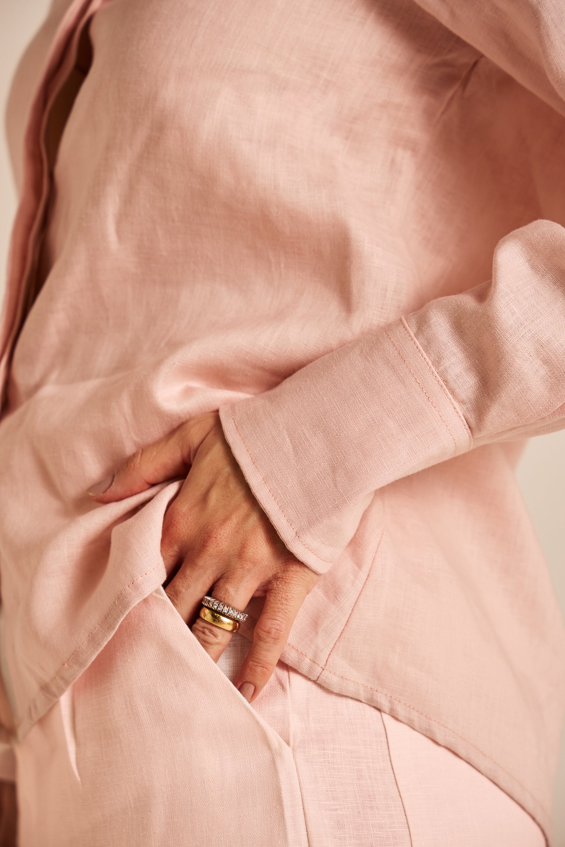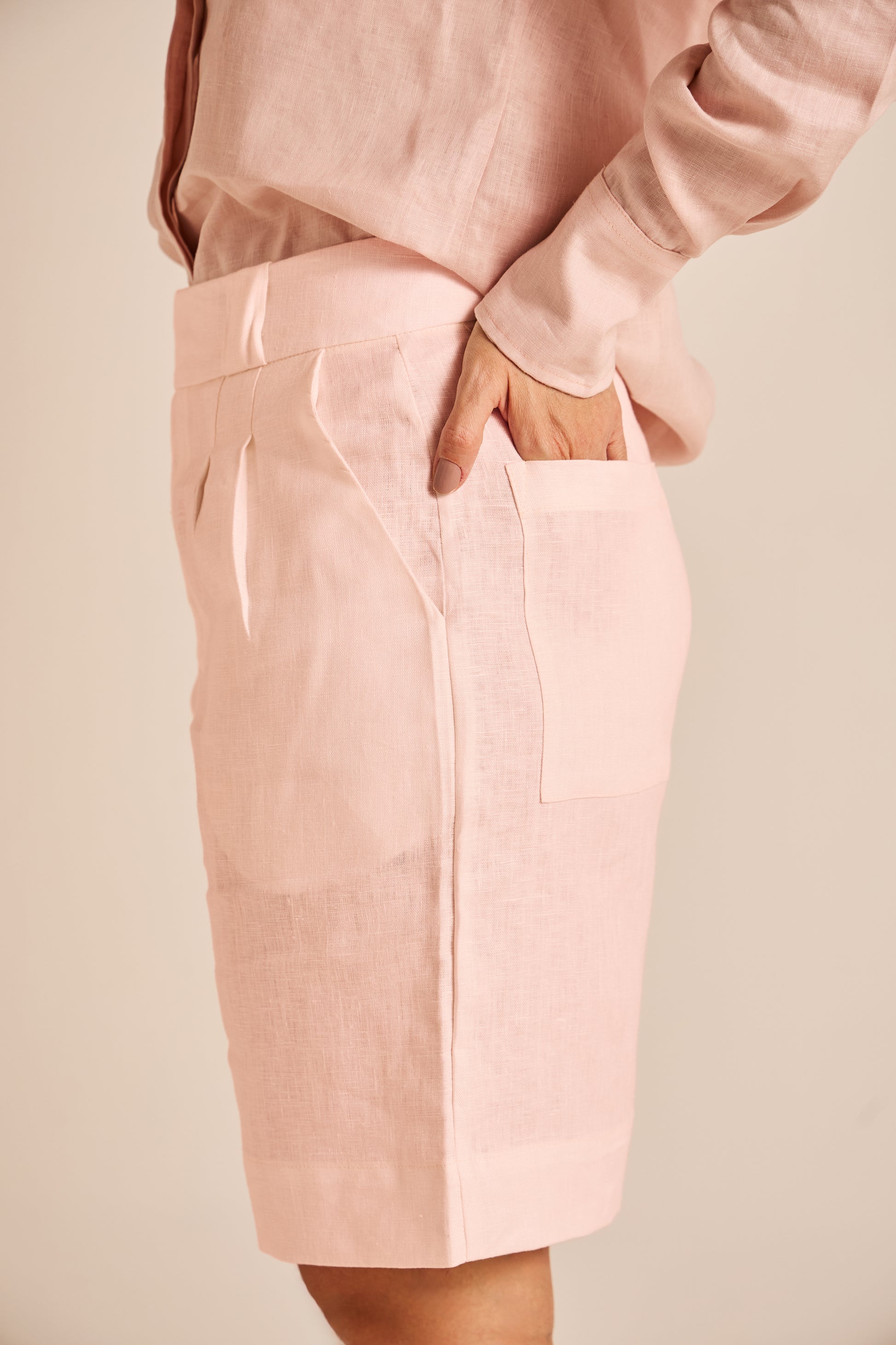 A Bermuda New Florence em linho puro combina leveza, frescor e caimento impecável, oferecendo conforto absoluto sem abrir mão da sofisticação. Com corte fluido e cintura alta, valoriza a silhueta de forma natural e elegante, enquanto o cós com transpasse sutil acrescenta um detalhe refinado e moderno à peça.