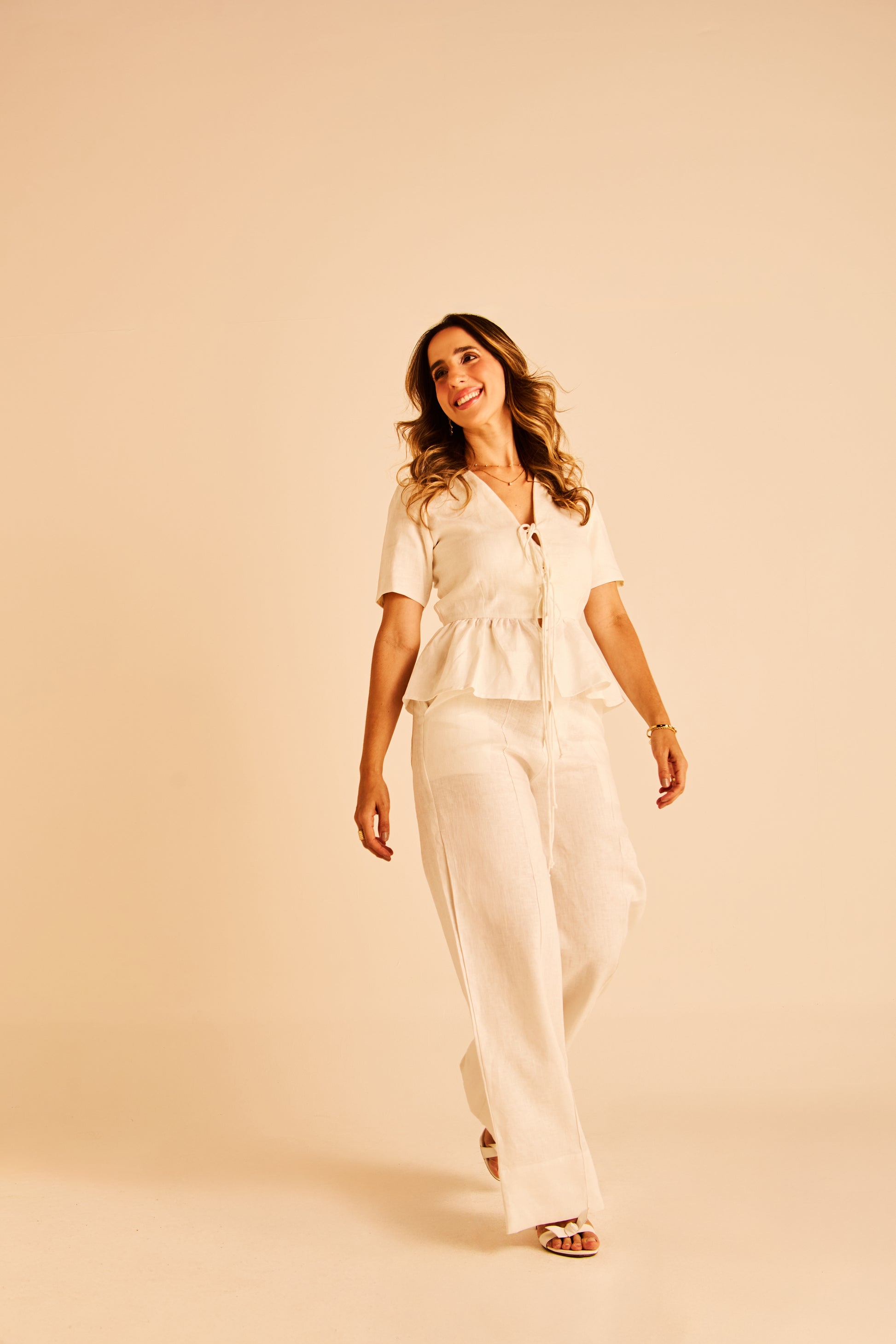 O toque fresco e fluído do linho torna essa pantalona ideal para quem busca unir sofisticação e conforto em qualquer ocasião. Uma peça versátil e atemporal, perfeita para compor looks que transitem do dia a dia elegante a momentos especiais com naturalidade.