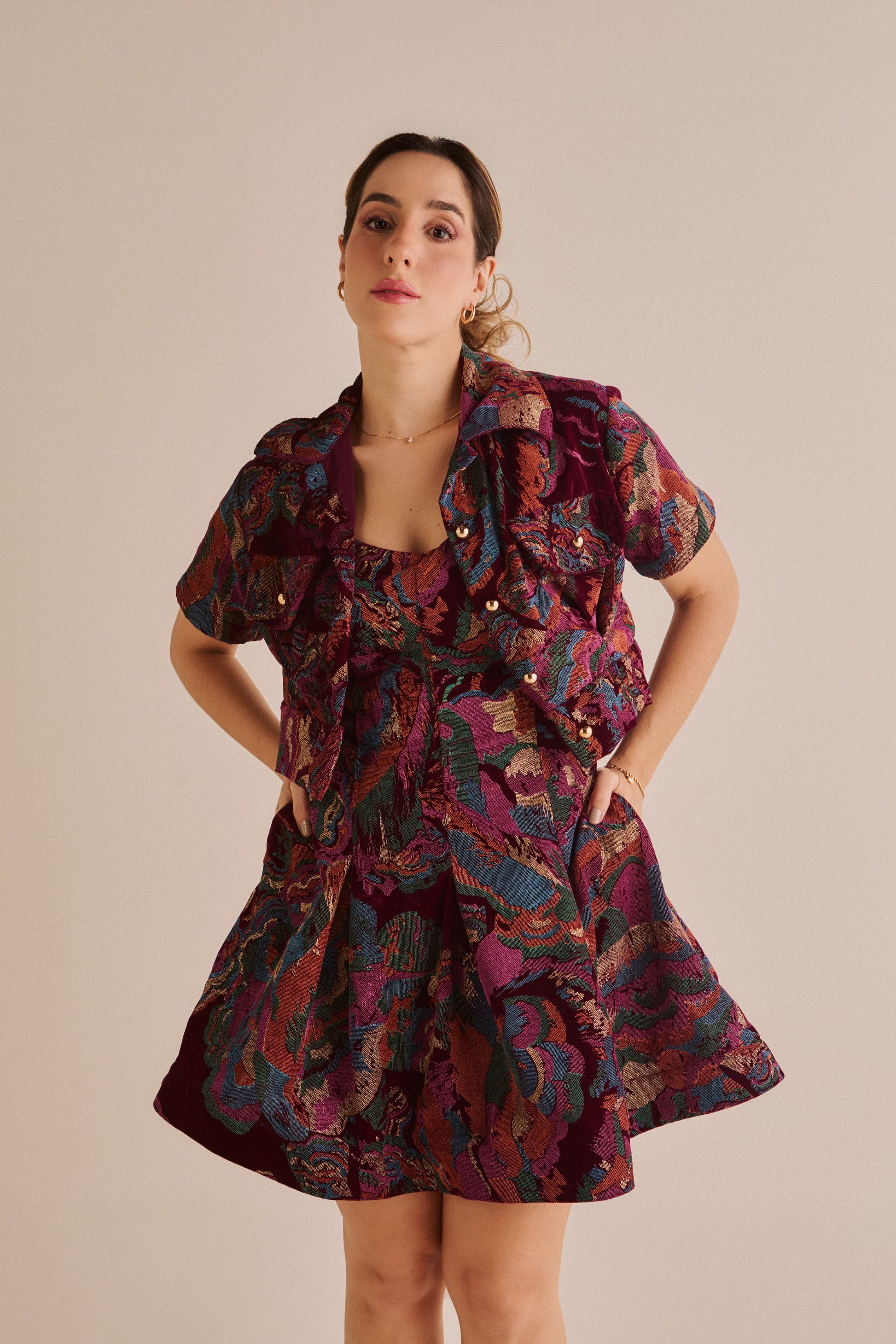 O Casaquete Luma apresenta construção em veludo estampado, oferecendo textura e padrão diferenciados. Seu design acinturado realça a silhueta com elegância, enquanto os botões dourados adicionam um toque de sofisticação. Conta com dois bolsos frontais práticos que combinam funcionalidade com estética refinada, ideal para composições versáteis e elaboradas.