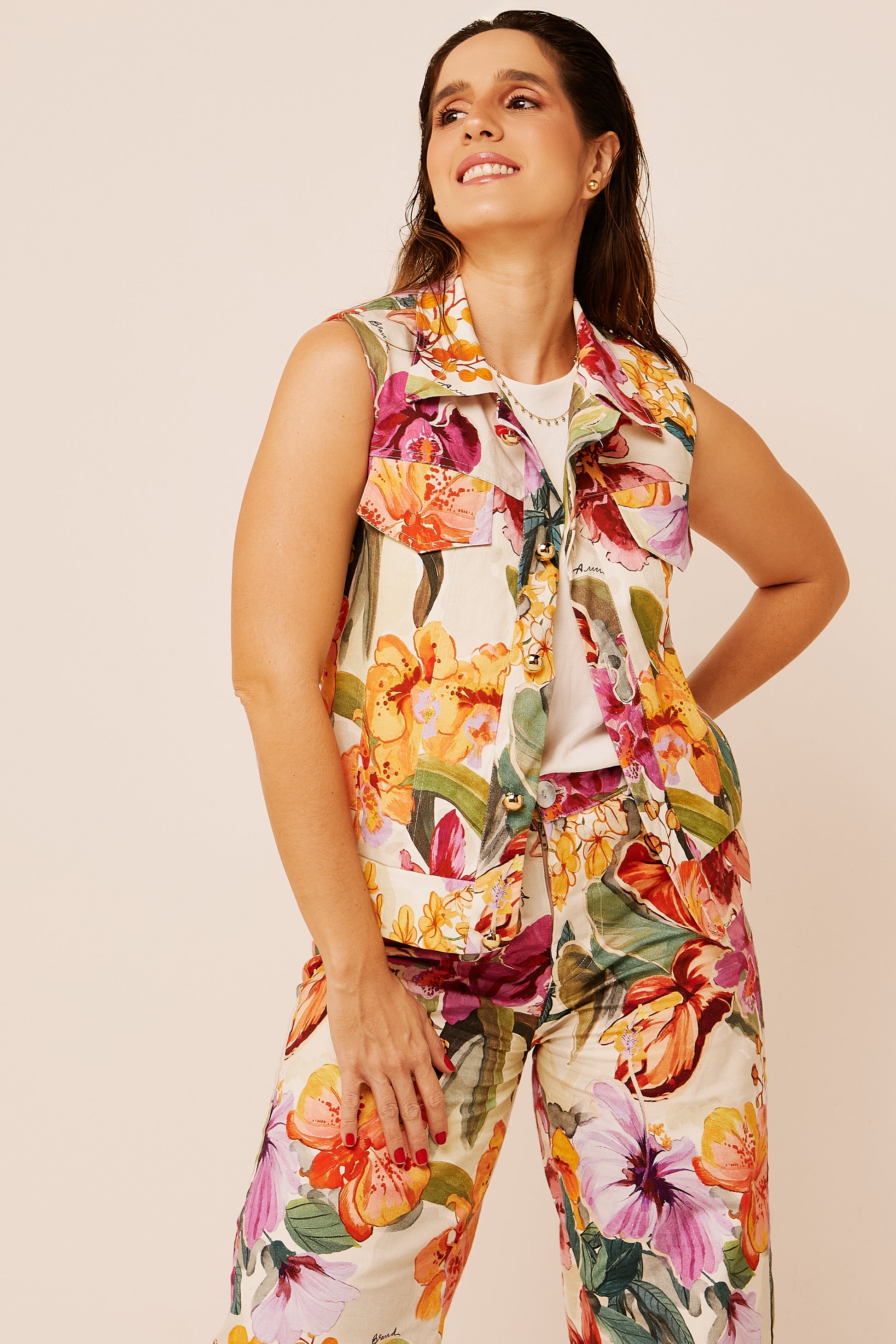 O design sem mangas traz modernidade, enquanto os botões dourados adicionam um toque de sofisticação atemporal. A estampa floral equilibra delicadeza e personalidade, transformando a peça em um destaque versátil para composições que transitam entre o casual e o elegante.