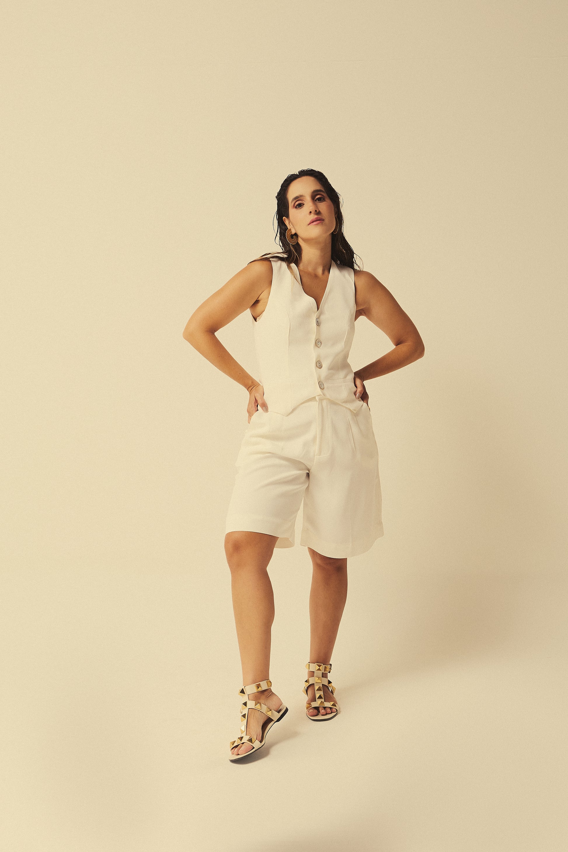 Bermuda em crepe, modelagem ajustada do corpo, cintura alta. Fechamento com zíper frontal e colchetes.