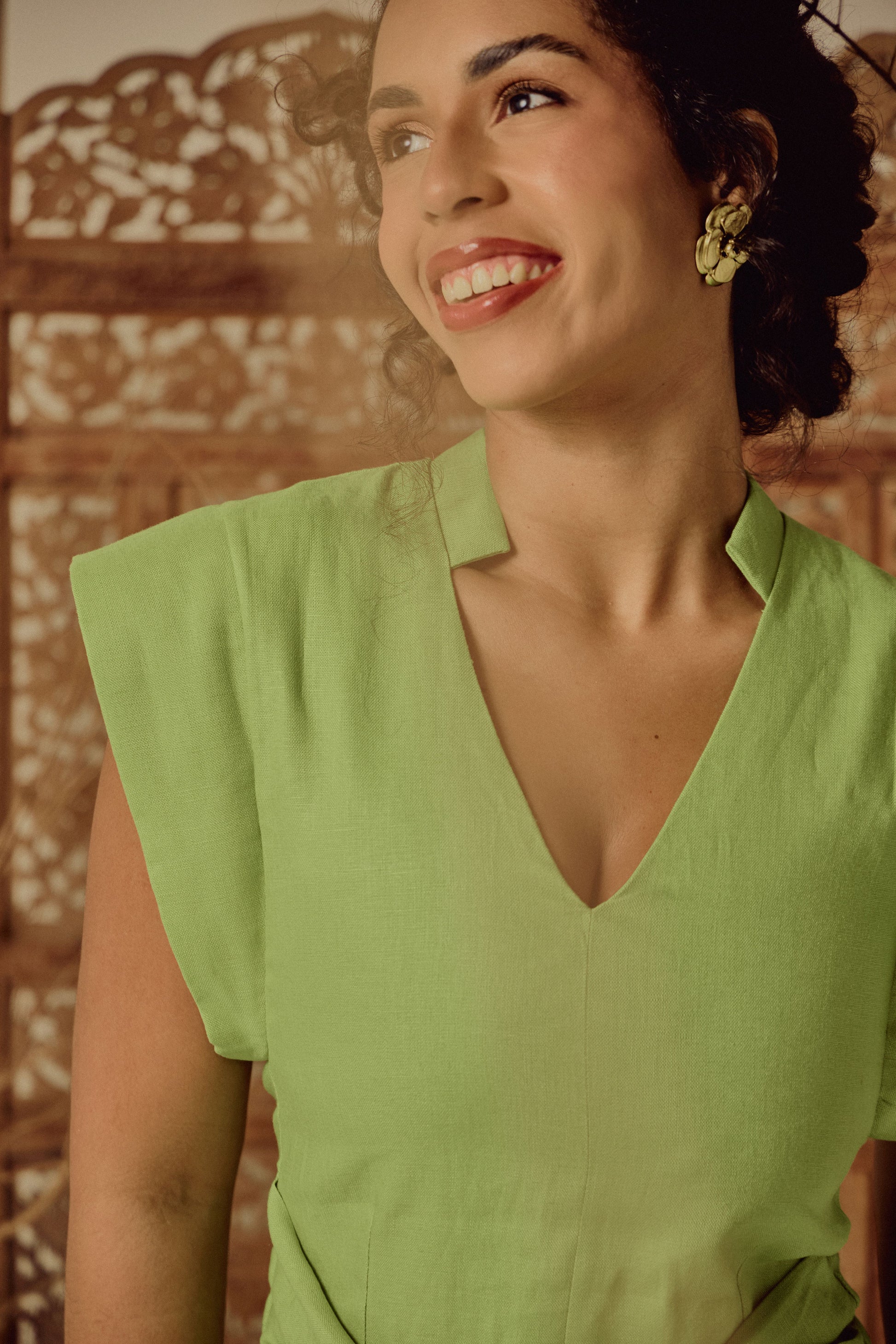 O Vestido Clarissa Verde Lima é ideal para ocasiões especiais. Confeccionado em linho puro, possui decote em V que valoriza o colo e laço embutido na cintura que modela a silhueta. A fenda frontal adiciona um toque de sofisticação ao estilo midi. Perfeito para um look elegante e moderno.
